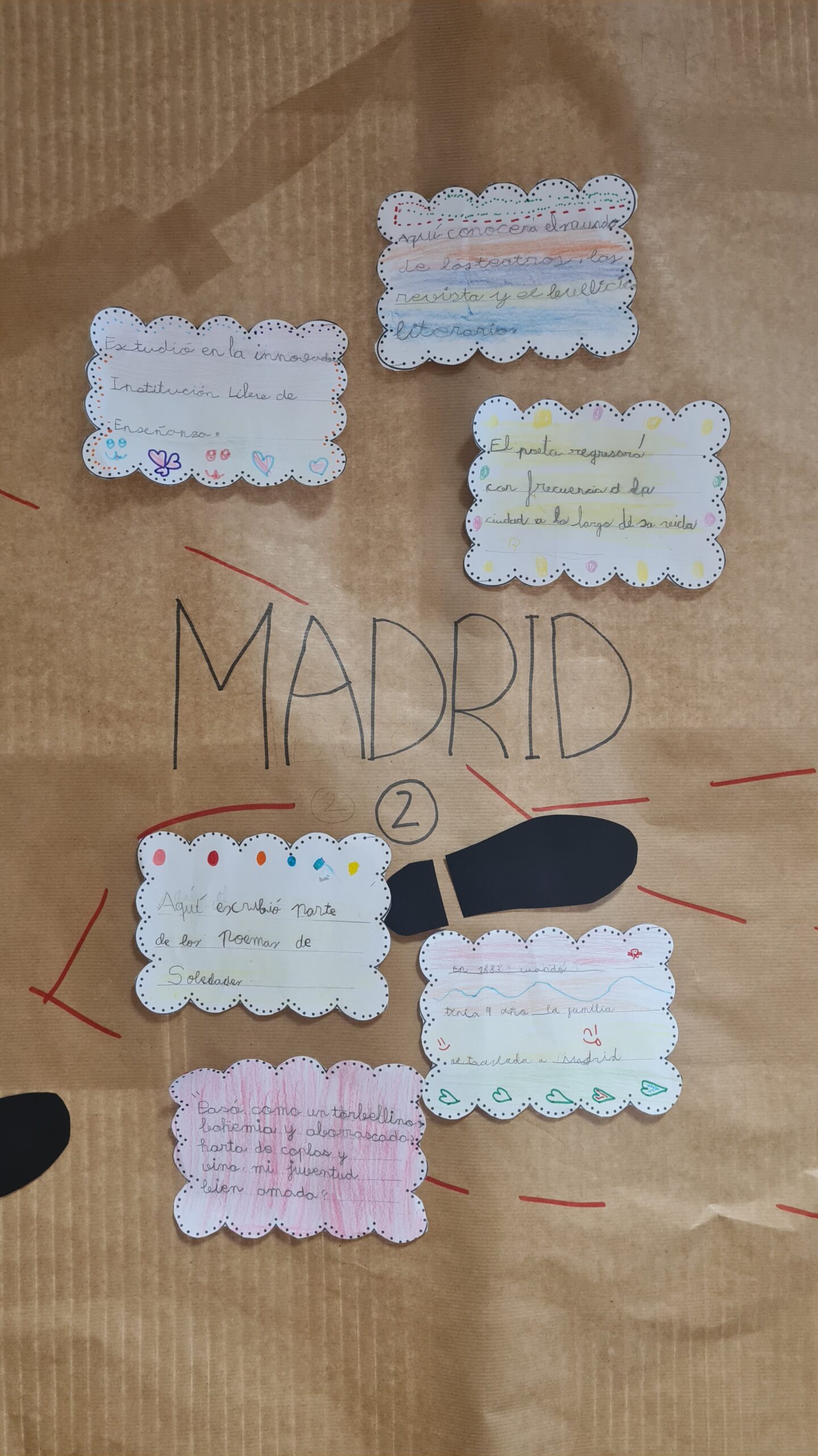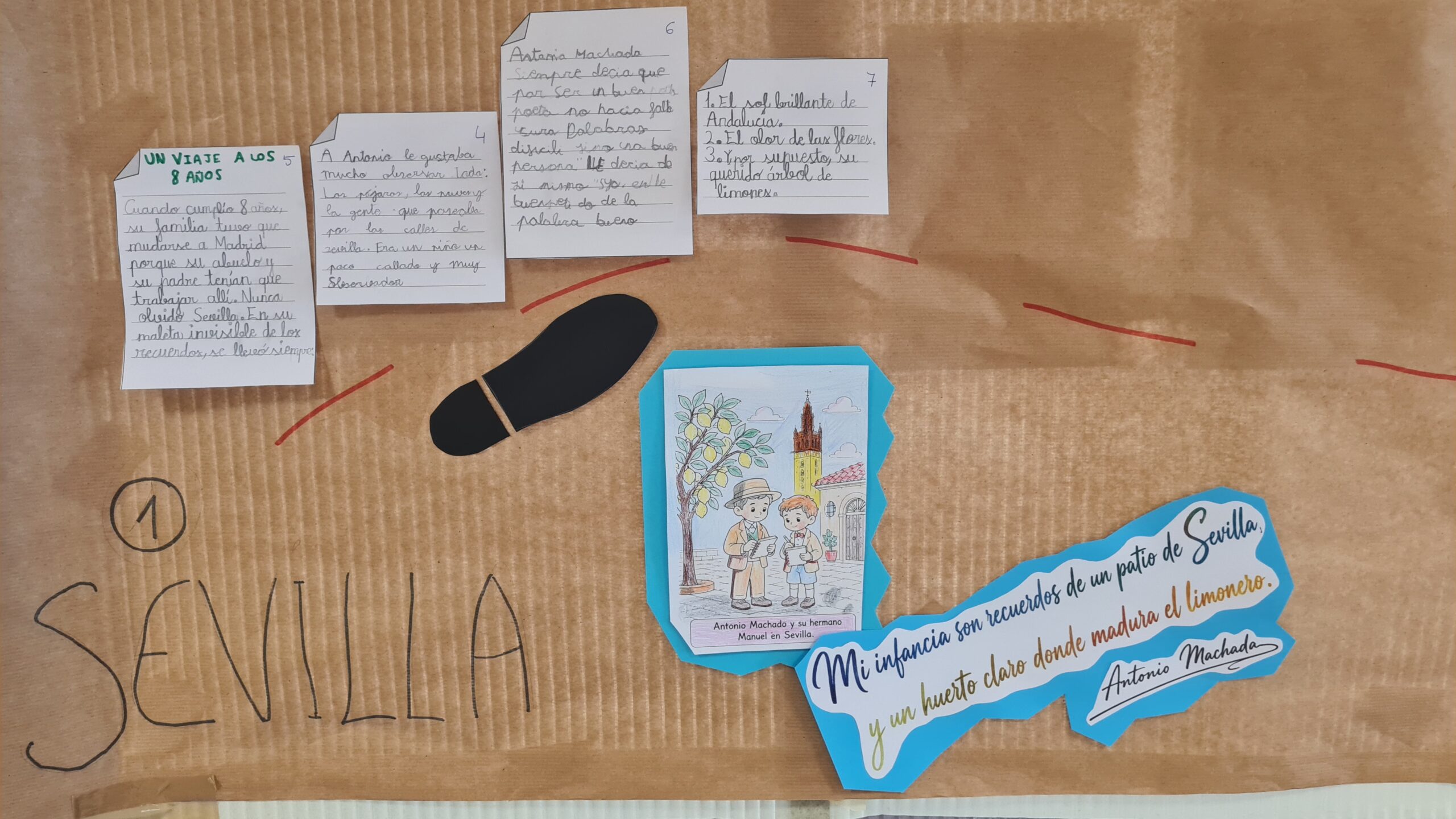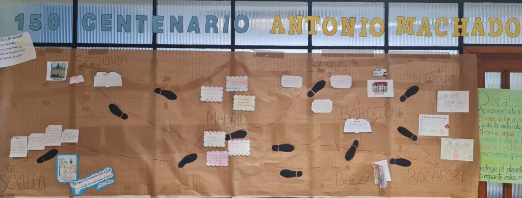 Este año hemos celebrado el día del libro recordando el 150 aniversario del nacimiento de Antonio Machado, figura clave de la Generación del 98. Para ello hemos realizado una línea del tiempo de su vida recorriendo sus diferentes etapas y aprendiendo alguna de sus poesías.